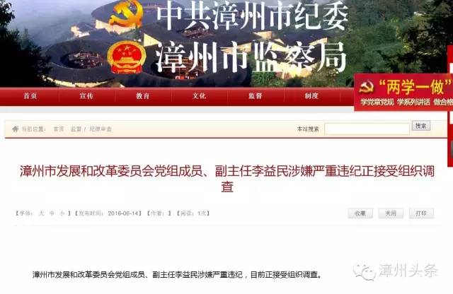 漳州頭條從中共漳州市紀(jì)委、漳州市監(jiān)察局網(wǎng)站獲悉,州市紀(jì)委今天早上剛剛權(quán)威發(fā)布,漳州市發(fā)展和改革委員會黨組成員、副主任李益民涉嫌嚴(yán)重違紀(jì),目前正接受組織調(diào)查。